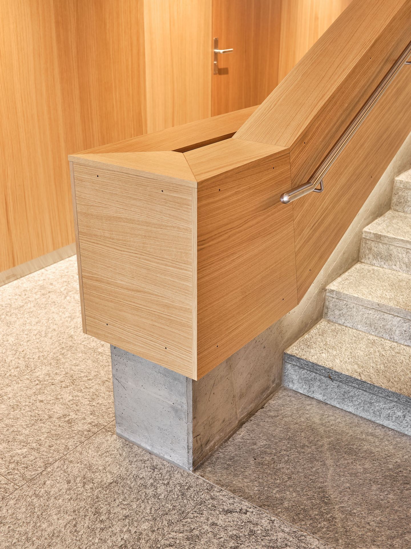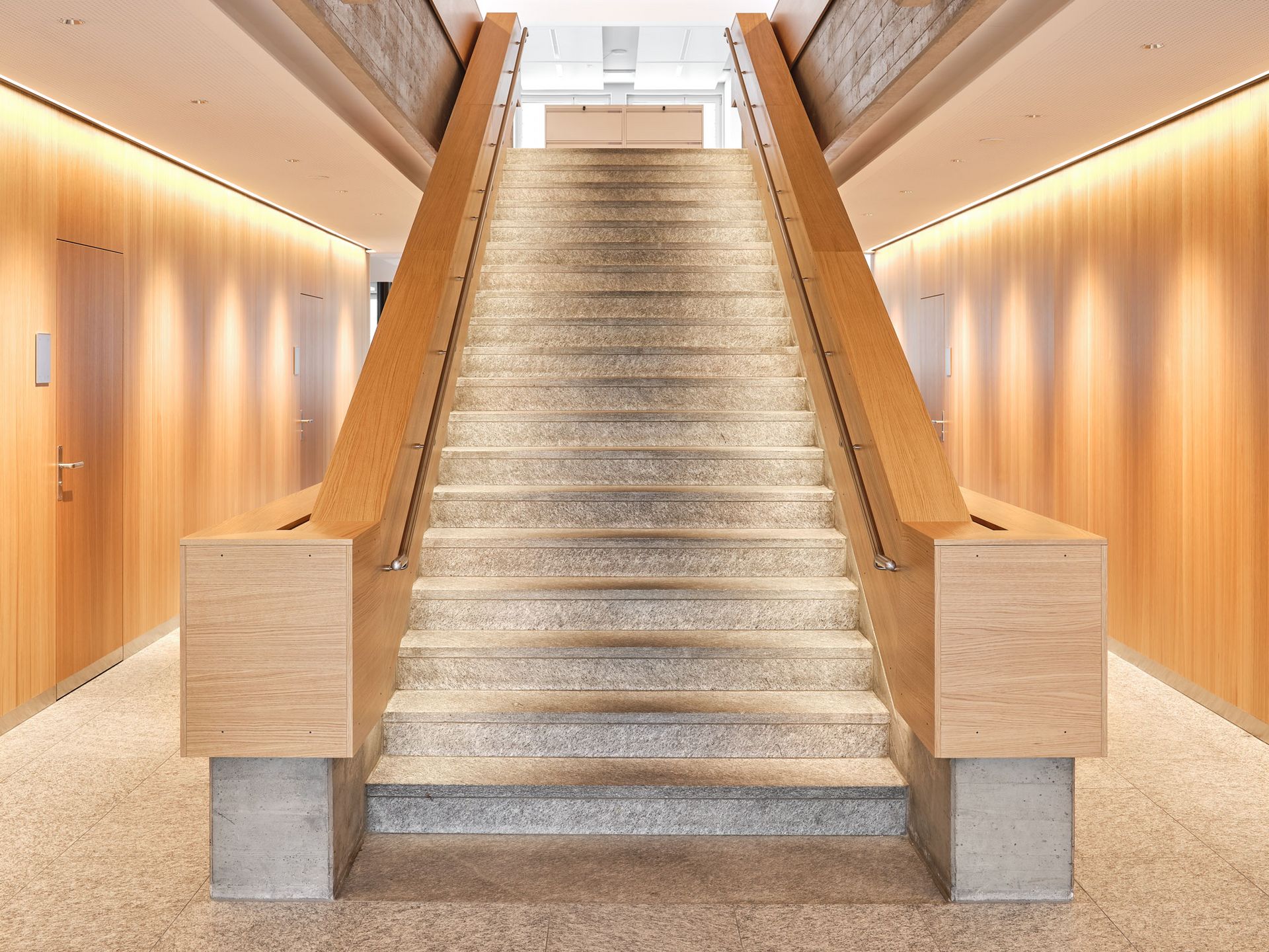 Das Furnier in Eiche schlicht wurde im gesamten Innenausbau über mehrere Geschosse hinweg eingesetzt und prägt die architektonische Identität entscheidend: