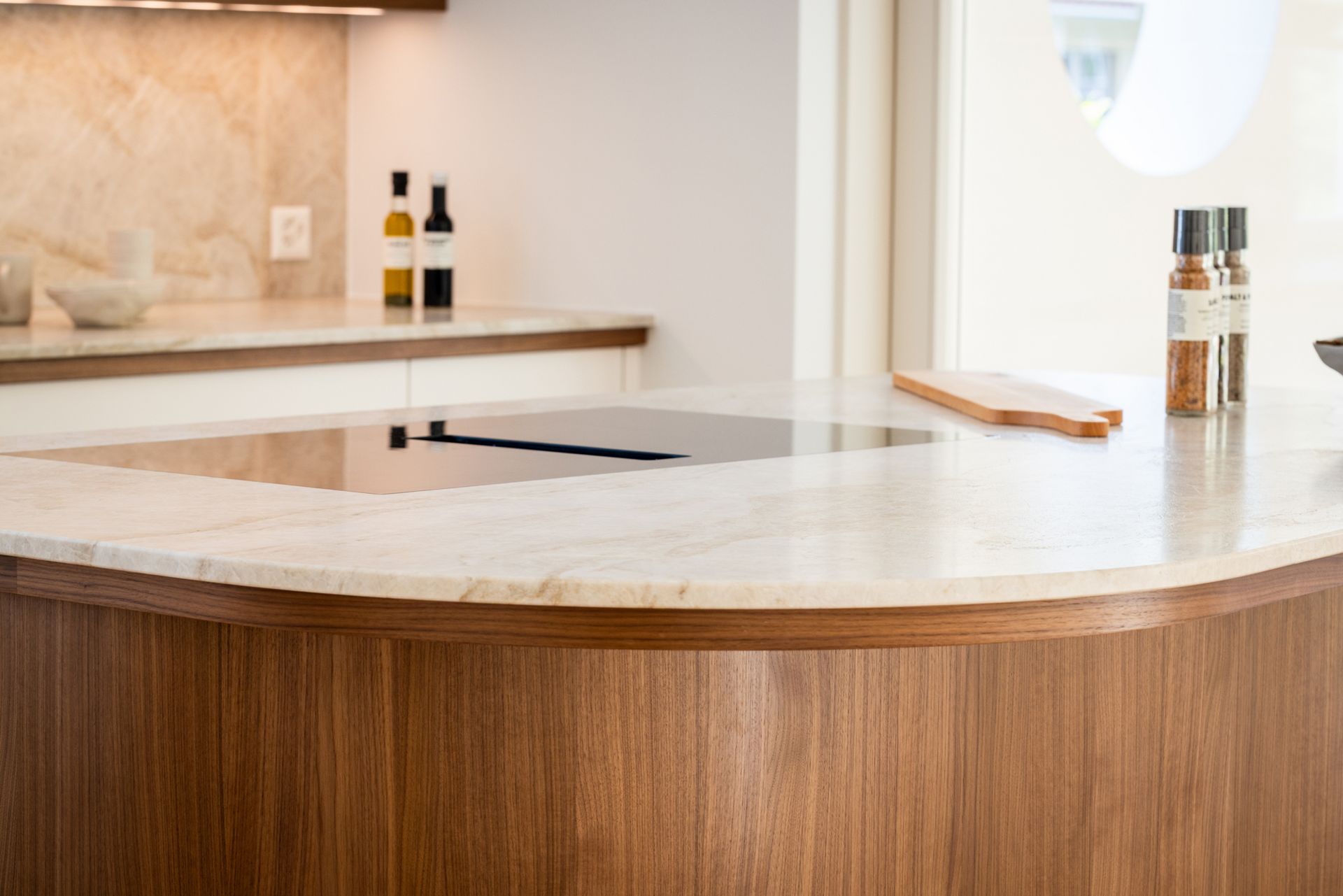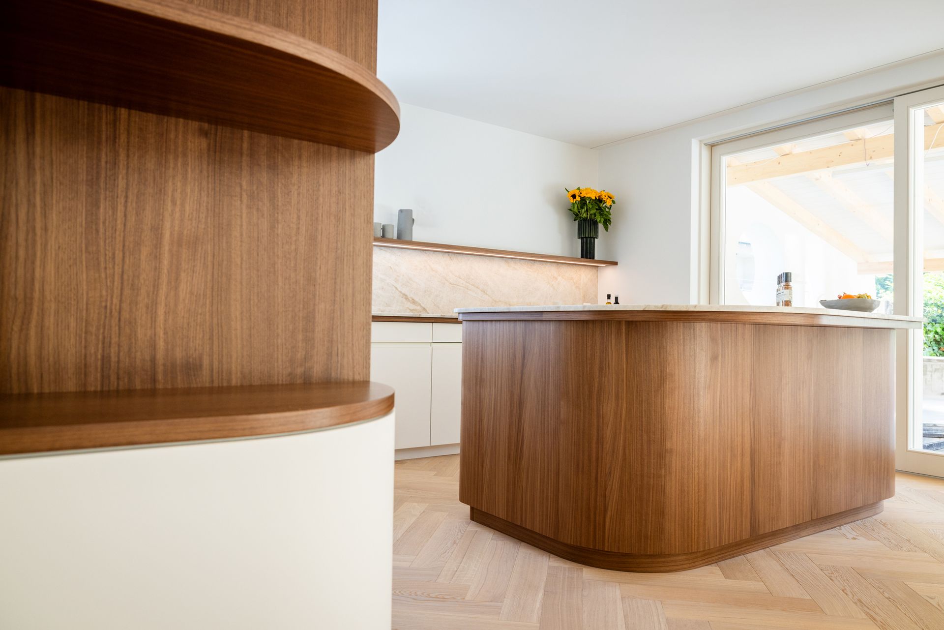 Diese grosszügige und lichtdurchflutete Küche verbindet zeitlose Architektur mit handwerklicher Präzision. Die abgerundete Kochinsel bildet das gestalterische Zentrum des Raumes. Ihre organische Formensprache verleiht der Küche eine sanfte Ruhe und unterstreicht den hohen Designanspruch des gesamten Innenausbaus.