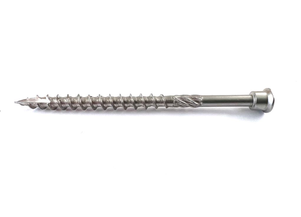 Martensitischer Edelstahl C rostfrei gehärtet, die Sonderkopfform verhindert das Spanaufstellen, mit Antrieb Torx TX, mit Schaft und Reibgewinde, Spitze mit Schneidkerbe verringert die Spaltgefahr, 60% höheres Bruchdrehmoment als herkömmliche Edelstahlschrauben, für die Befestigung von Paneelen auf Holzunterkonstruktionen, (Fassaden und Terrassen),