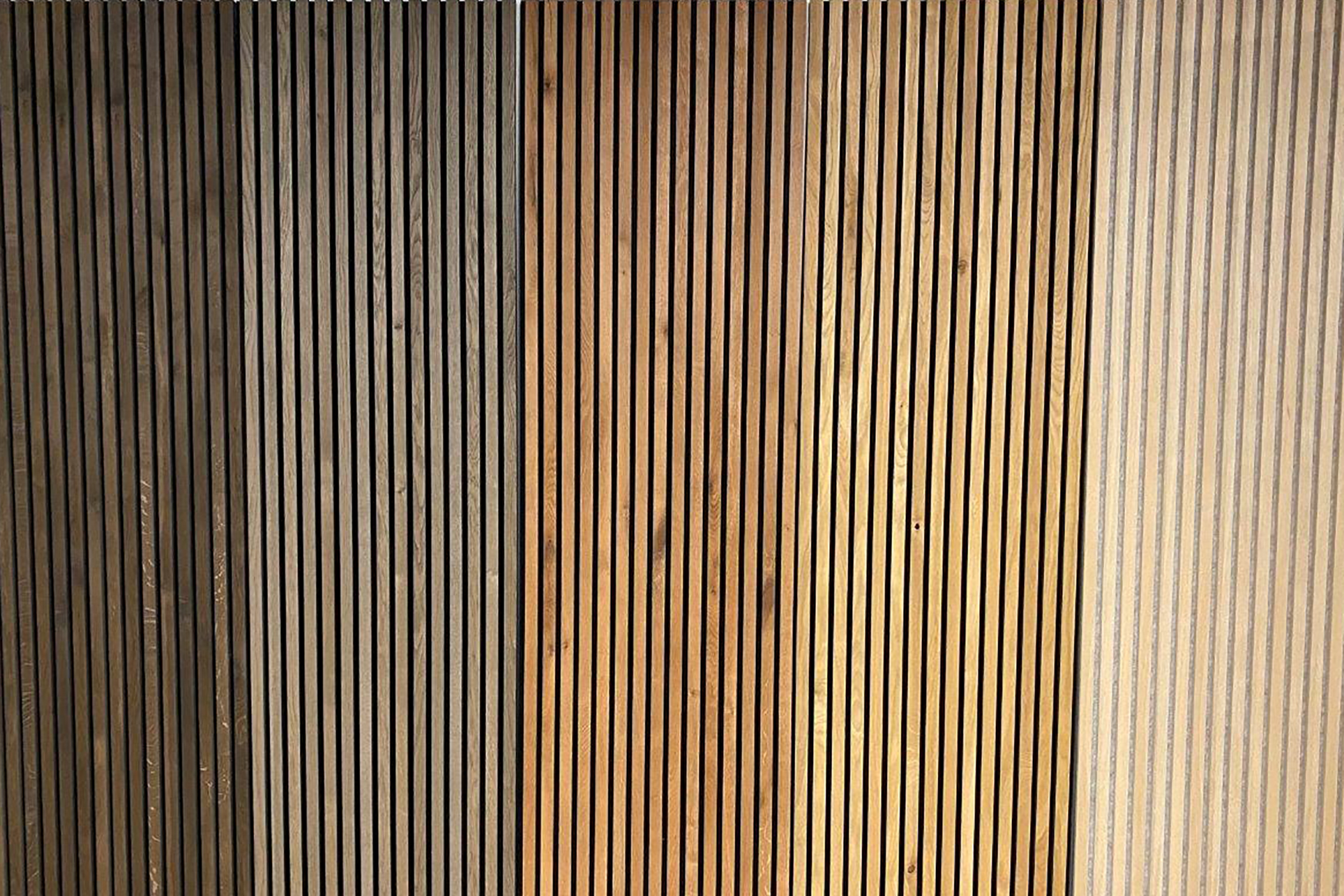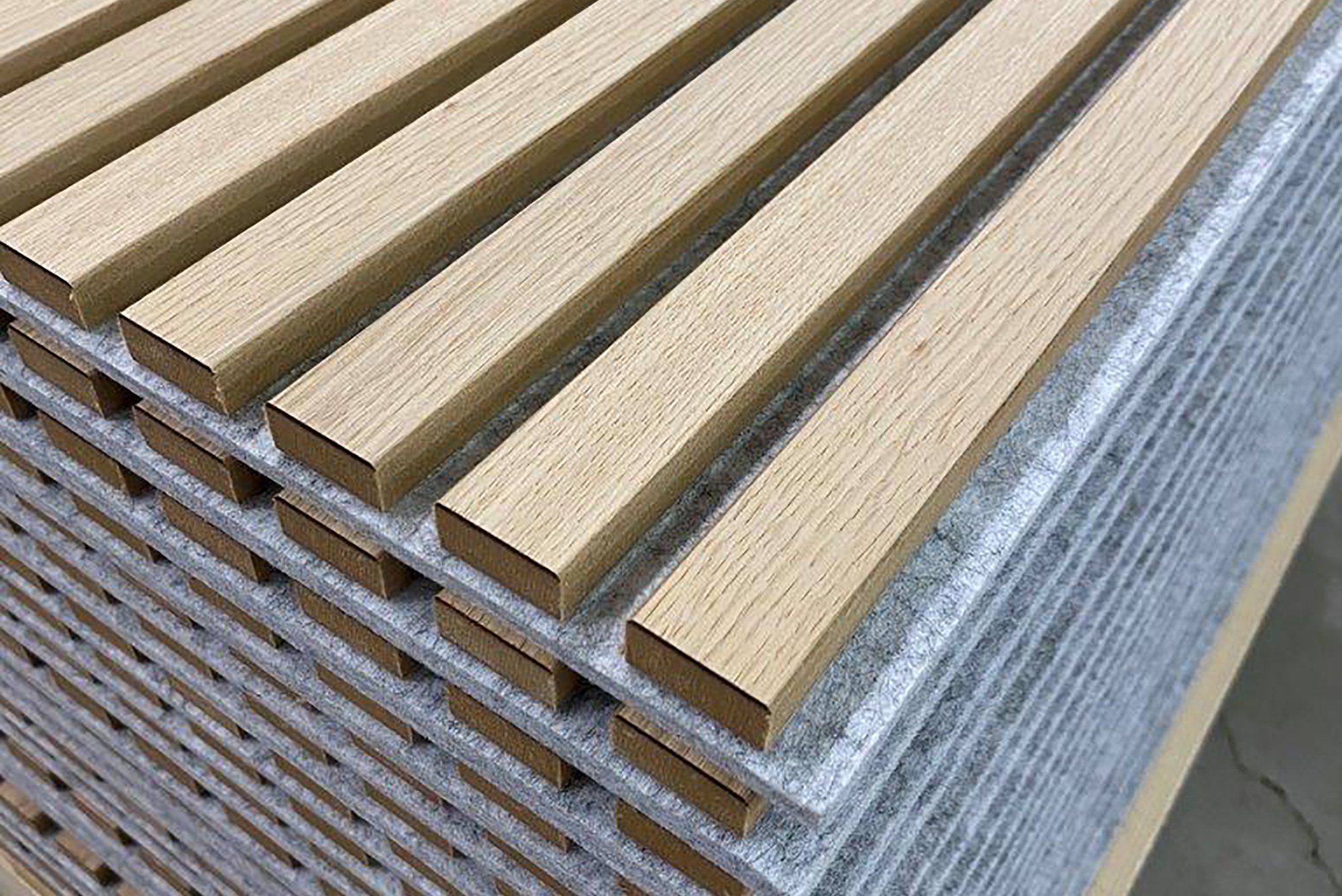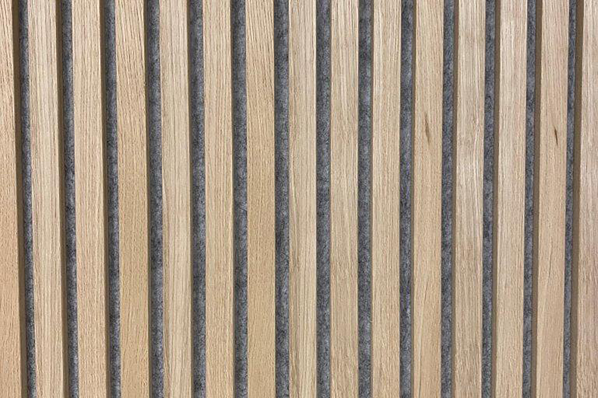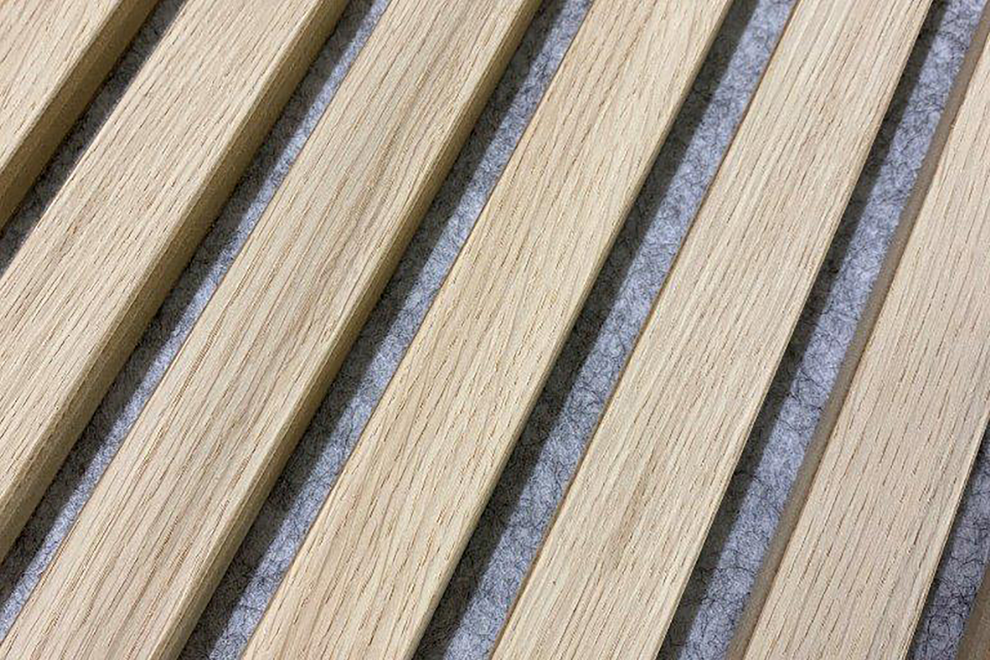 Akustik-Paneel in Eiche schlicht Oberfläche geschliffen mit grauem schallabsorbierendem Vlies
